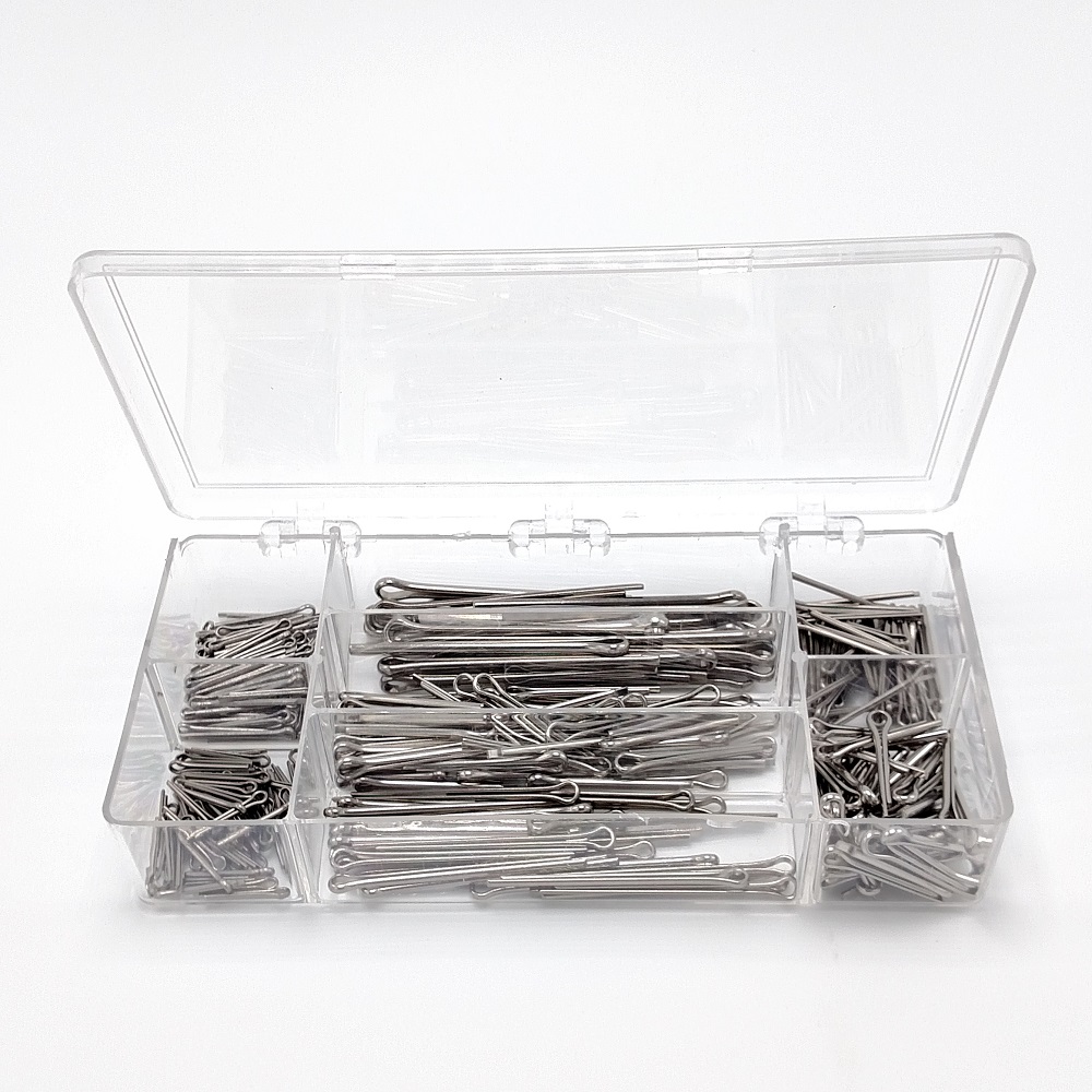 MS24665 stainless cotter pin 300pc assortment. this kit comes with the organizer and the following cotter pins: 50ea MS24665-151 1/16 x 1/2, 50ea MS24665-153 1/16 x 3/4, 50ea MS24665-155 1/16 x 1, 50ea MS24665-300 3/32 x 3/4, 50ea MS24665-302 3/32 x 1-1/8, 25ea MS24665-308 3/32 x 1-3/4, 25ea MS24665-377 1/8 x 2
